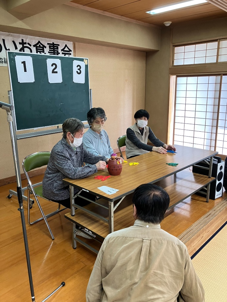 11月1日(土)東習志野コミュニティセンターでふれあい食事会を開催しました。今日の参加者は35名。最初に渡辺社会福祉協議会東習志野支部長と催し物を担当する実花町会の松村町会長から挨拶をいただきました。いよいよお待ちかねの催し物です。実花町会吉沢総務部長のリードで『お菓子釣り、黒ひげ危機一髪、1~3の数字あて、じゃんけん、ダーツ』等のゲームで楽しみました。その後は、江籠さんの素晴らしい歌声に魅せられ一緒に歌いました。さあ、これから調理班の皆さんが作ってくださった食事です。サバのカレー風味美味しかったです。